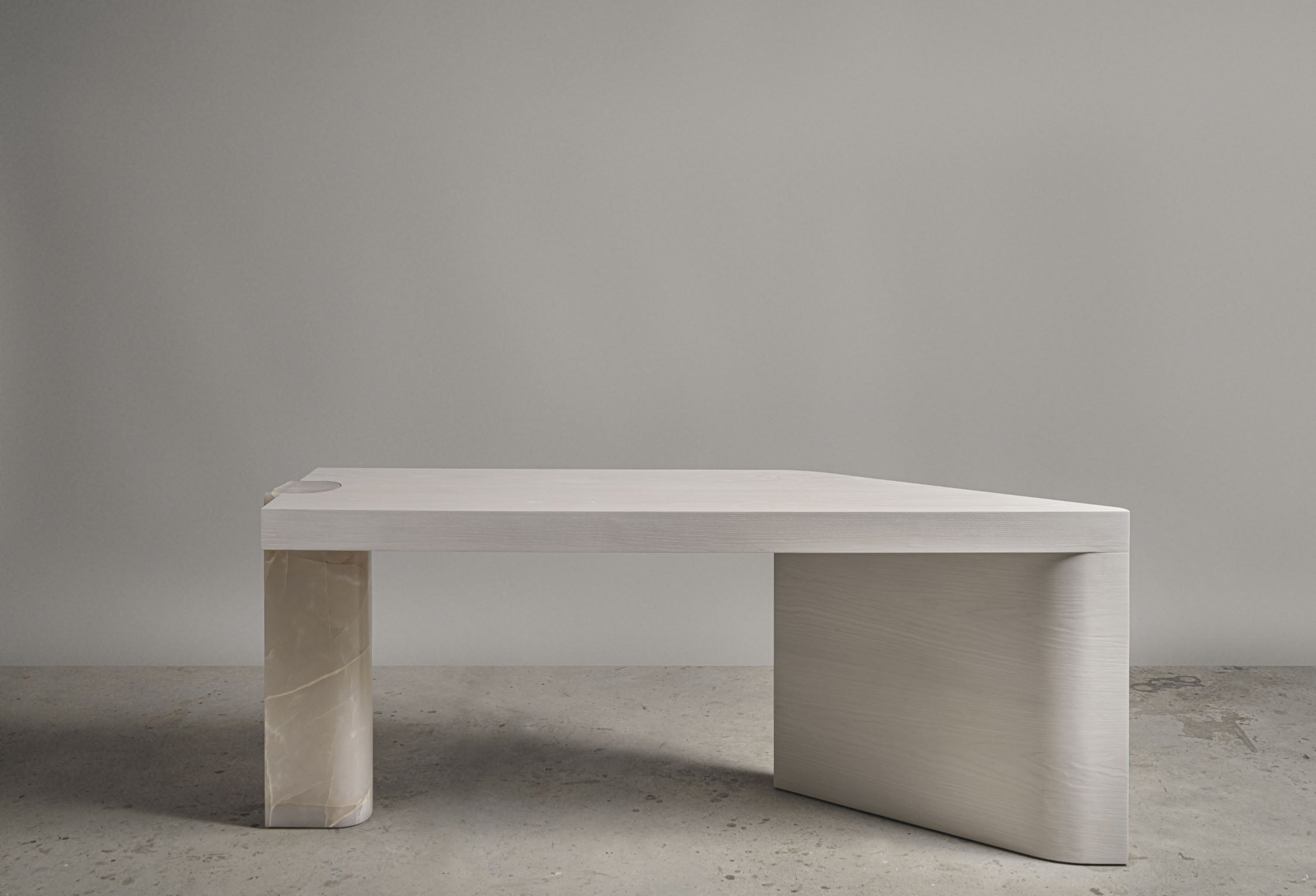 Это скульптурный жест, опирающийся как на традиционное ремесло, так и на технологические процессы будущего. Каждый лист шпона дерева был тщательно подобран для создания цельного образа. Древесный рисунок вообра- жаемой топографии течет подобно рисунку камня, следуя за той же идеей мастера, по всей поверхности. Резной белый оникс завершает композицию, предлагая твердый и изящный фундамент, одновременно сдер- жанный и мощный. Здесь возникает диалог между деревом и камнем — между органическим теплом перво- го и монолитностью второго, жестом мастера и сутью са- мого материала.