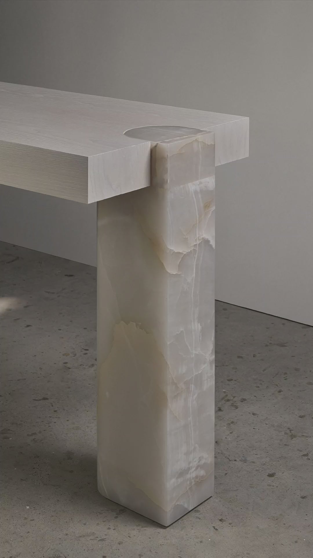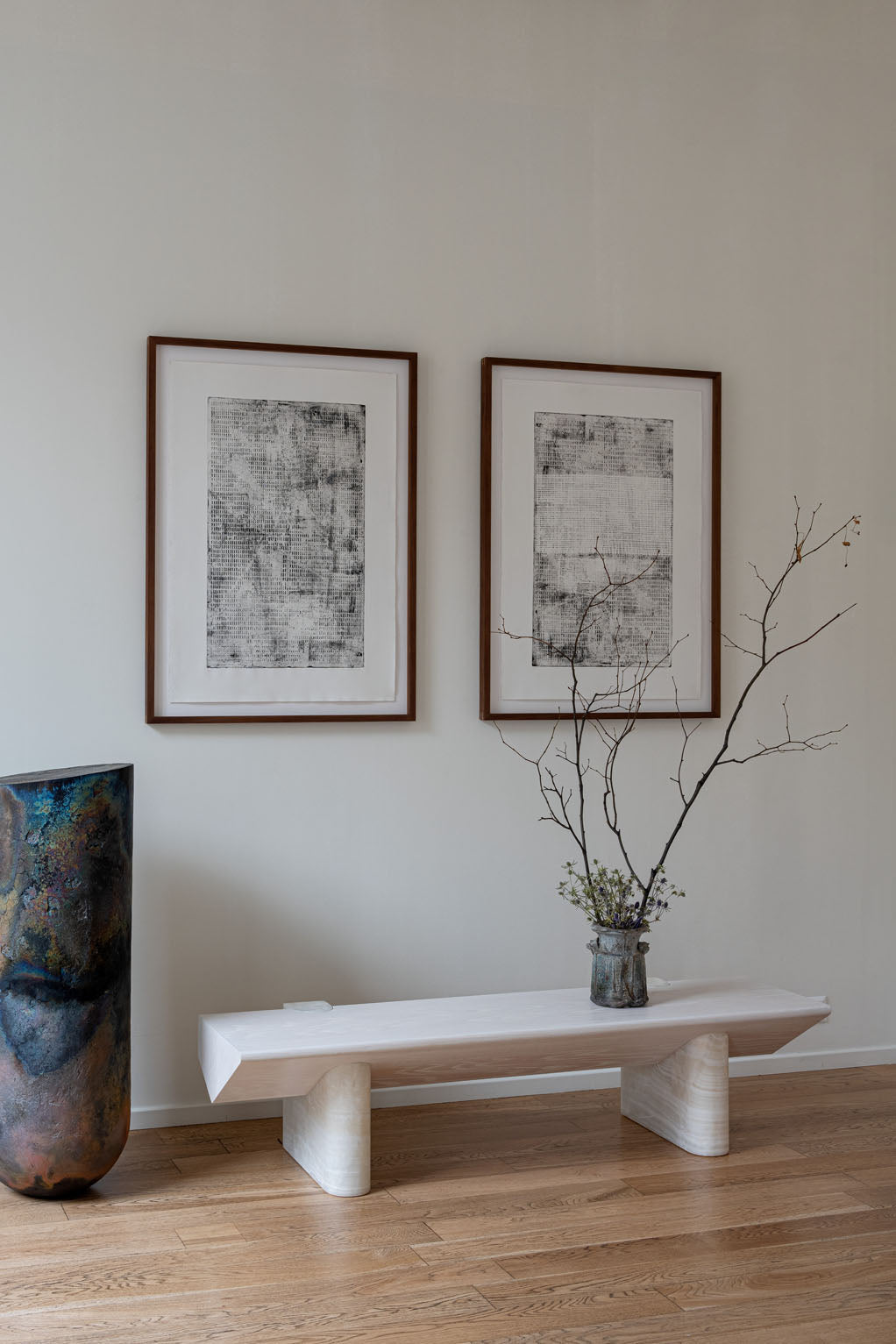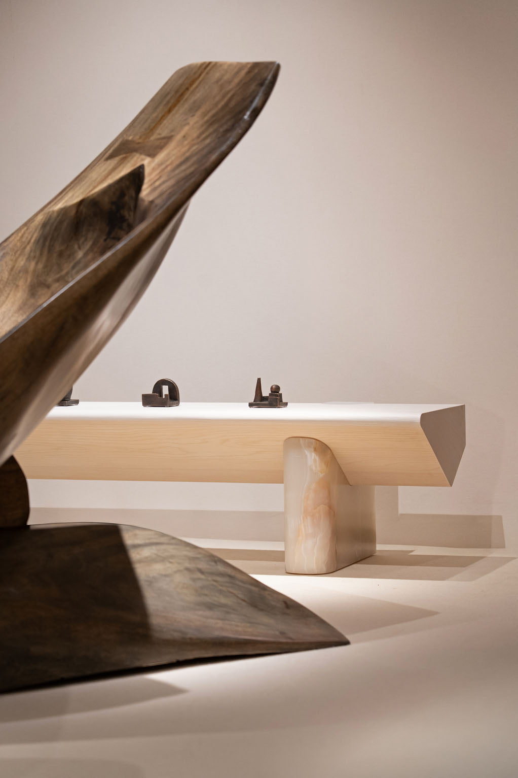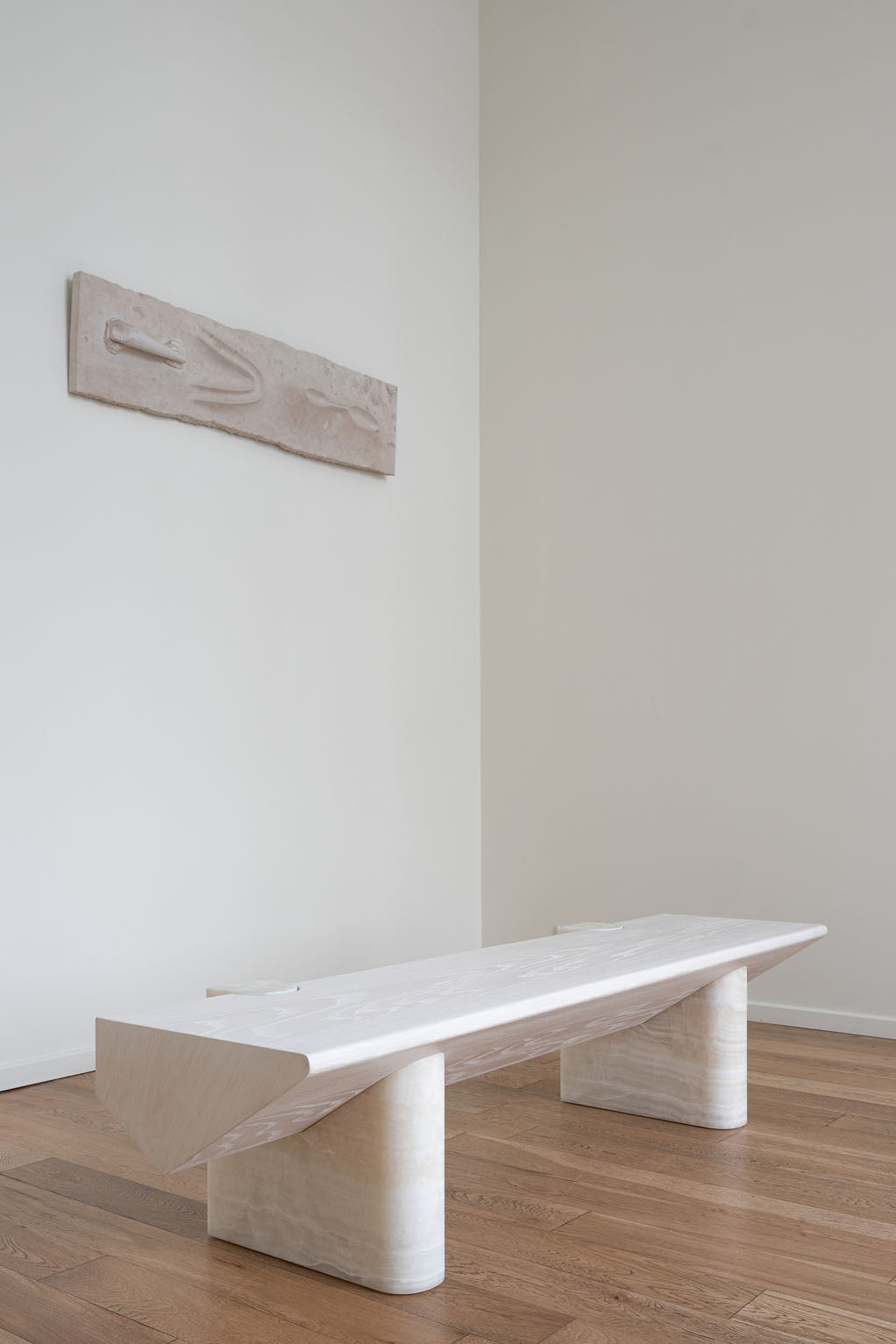 Первые предметы для коллекции Castle были раз- работаны Шарлем Калпакяном специально для Booroom Gallery в 2021 году. Теперь, по случаю PAD London, ее пополнили два новый объекта — консоль из дерева и оникса, а также стул, выполненный в той же технике. Ключевая идея коллекции — в том, как различные природные элементы создают скульптурное единство, как сочетаются вертикаль и горизонталь. Как человек, являющийся центром интеллектуальной конструкции, может преобразовывать и создавать элементы. «Эта коллекция основана на моем подходе к исторической архитектуре», — рассказывает дизайнер. Конструкция скамьи стала результатом долгой и кропотливой работы. Каждый фрагмент мрамора обра- ботан так, чтобы максимально раскрыть его рисунок, показать почти мистические соединения и совпадения узора камня. Его несовершенство рождает особый визуальный язык, а минеральное кружево узора позволяет пустоте «дышать».