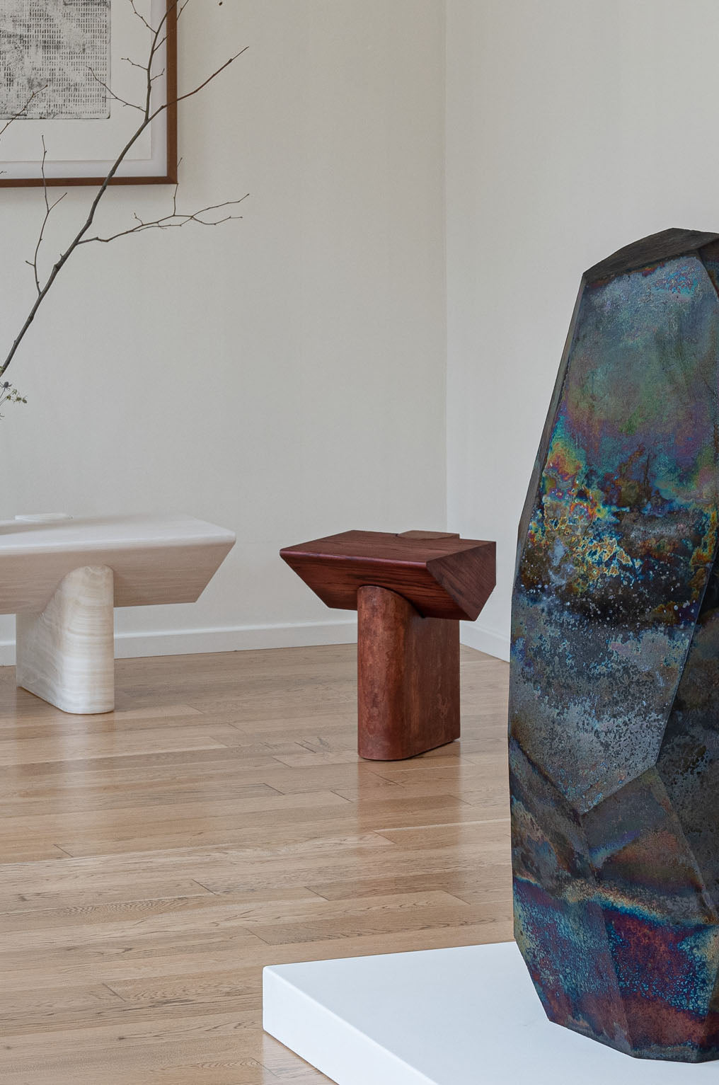 В его практике — сотрудничество с ведущими галереями, выставочными институциями и музеями — Design Miami, брюссельской выставкой Collectible, где он показывал свои созданные за время локдауна 3D-эксперименты с деревом.