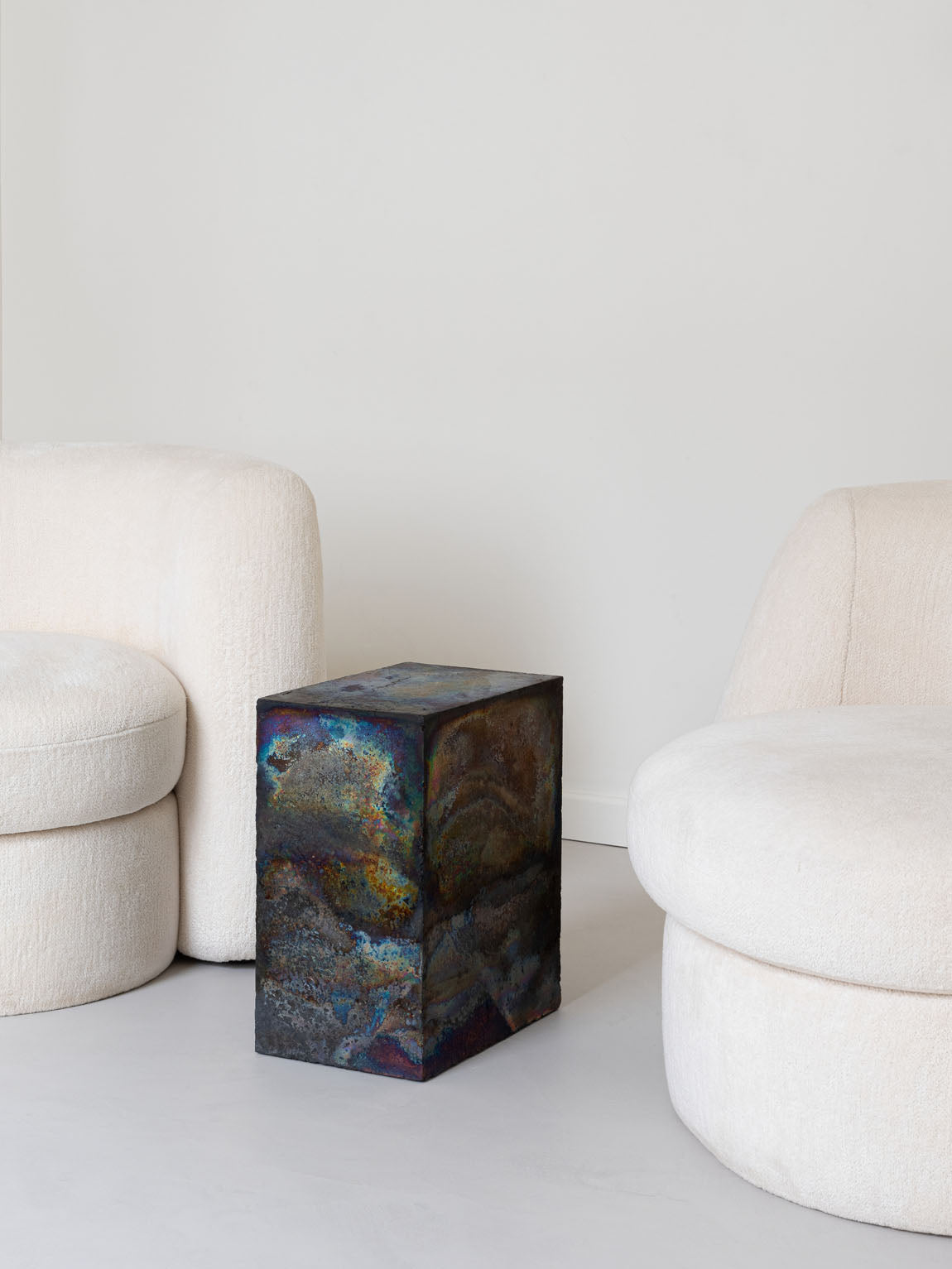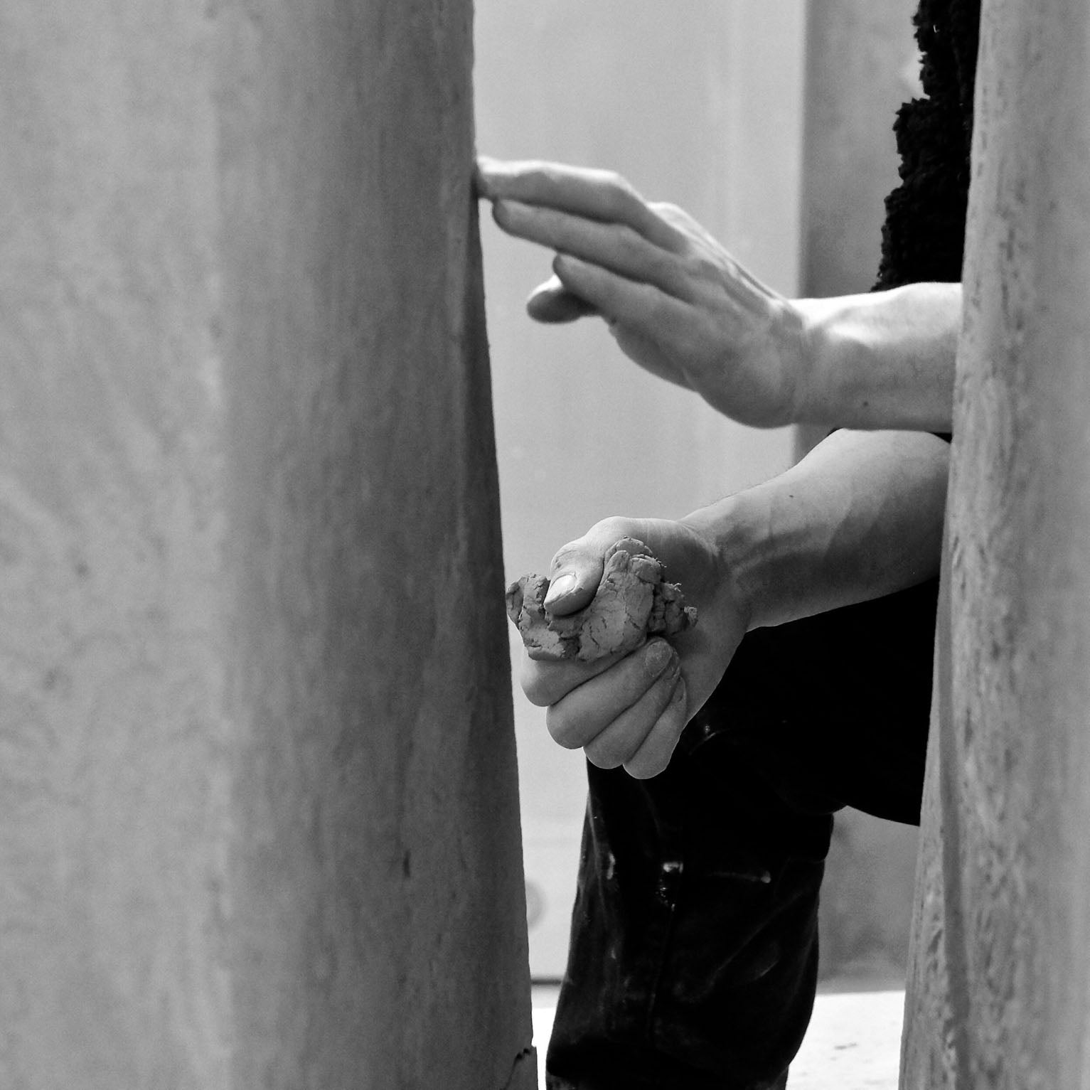 «Мой процесс создания строится за счет наслоения глины вручную — я никогда не вырезаю объекты. Готовая вещь сначала обжигается с помощью глазури, насыщенной оксидами металлов, затем снова обжигается и карбонизируется, чтобы подчеркнуть характер переливов металла на поверхности. Мне приходится каждый раз строить печь для каждой из моих работ», — поясняет керамист.