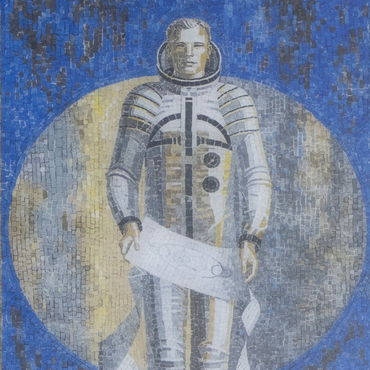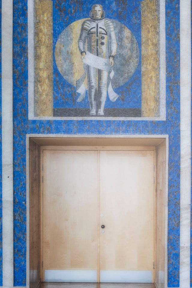 Над центральным входом в комплекс зданий МГИМО, выстроенных главным архитектором города Михаилом Посохиным (совместно с М. В. Першиным и Б. Н. Колотовым), на каменной облицовке выступают три металлических рельефа со Спасской башней Кремля и двумя аллегорическими фигурами. В одном из корпусов, где размещается конференц-зал, над входными дверями — но уже в интерьере - также стоят полноростовые фигуры: космонавт, строитель, художница и еще две женщины: одна с венком над головой, другая - с лавровой ветвью и алым штандартом. Оригинальное пластическое решение в общей синей тональности с золоченой смальтой по арматуре, древку и листьям лавра выделяет аллегории строительства, космоса, искусства, славы и государственности. Эстетика монументального оформительства позднего модернизма отмечена легкой печалью в настроении персонажей и вместе с тем при всей виртуозности кладки и рисунка смягчает пропагандистский пафос.
